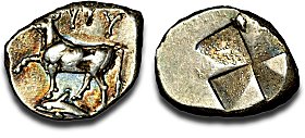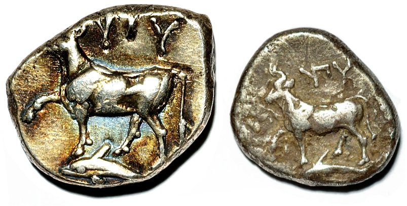 Det mindre av de två mynten ovan är en hemidrachm, dvs en halv drachm. Myntet är slitet och korroderat, men har ändå något för stor vikt för att motsvara standarden från Attika och Euboea. Myntet slogs antagligen för att motsvara vikten av en halv siglos.