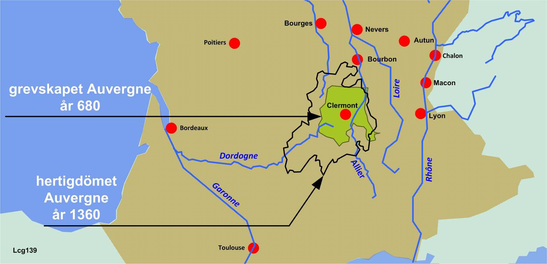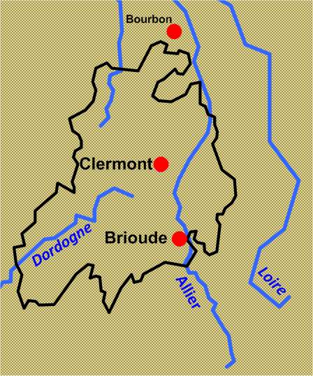 Efter Västromerska rikets kollaps bredde Frankerriket ut sig inom Roms forna territorium. I östra Akvitanien, på gränsen mot hertigdömet Burgund, uppstod det självständiga grevskapet Auvergne med en utbredning som i stort sett motsvarade det område som tidigare hade tillhört det keltiska folket Arverni. Staden Clermont anlades på platsen för den keltiska byn Nemossos. Se bilderna 1 och 4. Det var i Nemossos som Vercingetorix hade vuxit upp.