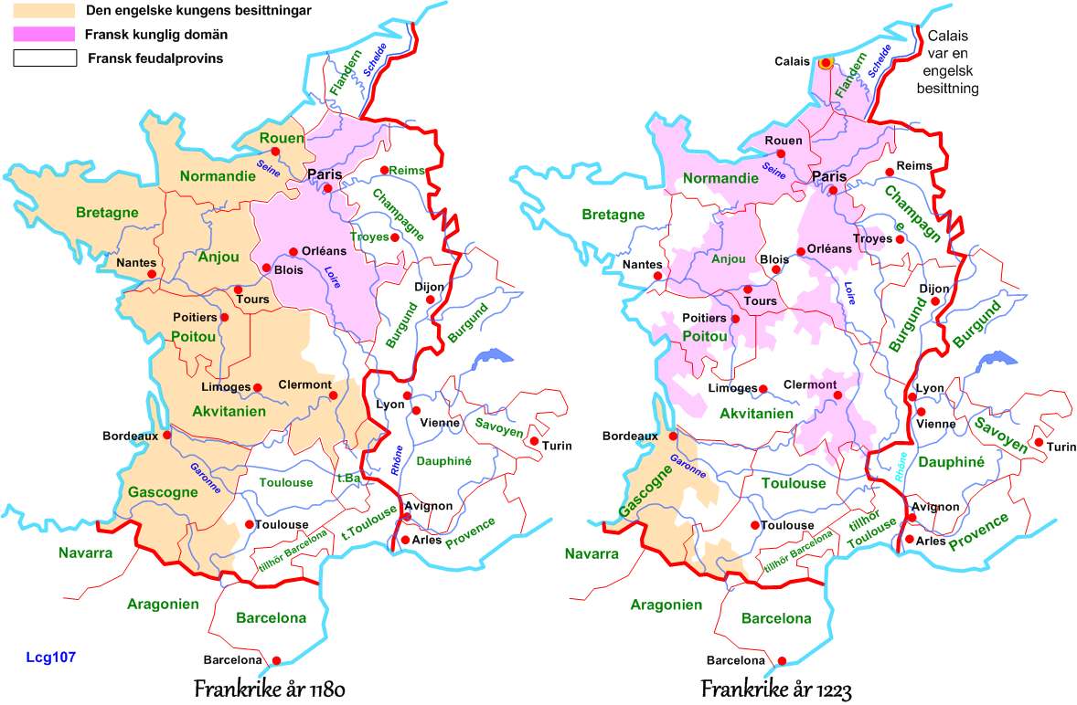 7. Engelska besittningar i jämförelse med den franske kungens domäner år 1180 och 1223