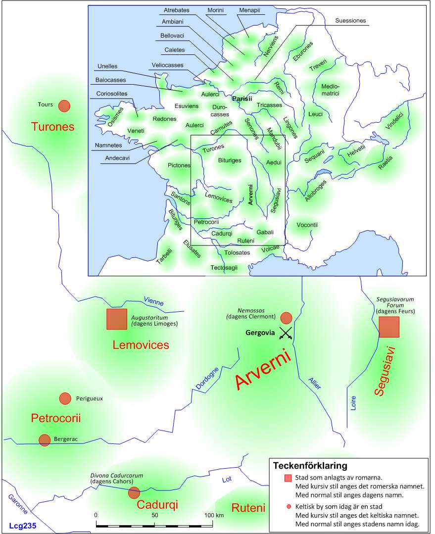 En av de galliska hövdingar som har låtit tala om sig var Vercingetorix av folkstammen Arverni. Bild 1. I slaget vid Gergovia år 52 f.v.t. besegrade han Julius Caesar med sitt kavalleri. Efter en tid vände krigslyckan för Vercingetorix och han togs till fånga och tvingades kapitulera. Därefter fördes han till Rom och avrättades, vilket innebar slutet på det galliska kriget.
