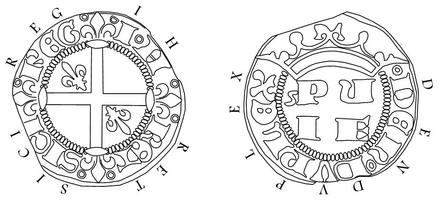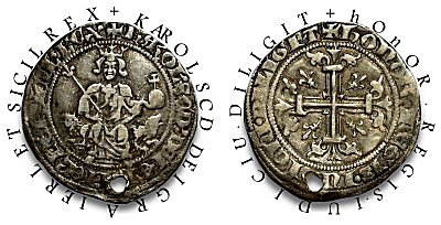 Åtsidans omskrift kan man fundera över. Är den rätt? Under den revolt som fick namnet "Den Sicilianska aftonsången" gick ju Sicilien förlorat för Neapel. Under stridigheterna blev Karl II tillfångatagen och i samband med frigivningen 1288 tvingades han lova att lägga bort titeln "kung över Sicilien". Hur kunde han hävda att han år 1303 fortfarande var Siciliens kung? Jo, svaret är ganska enkelt. Påven, som Karl var allierad med, löste nämligen Karl från löftet.