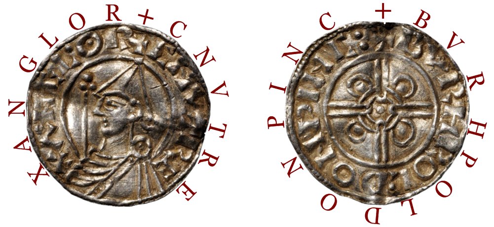 Åtsidans omskrift: + CNUT REX ANGLOR (Knut kung av England)