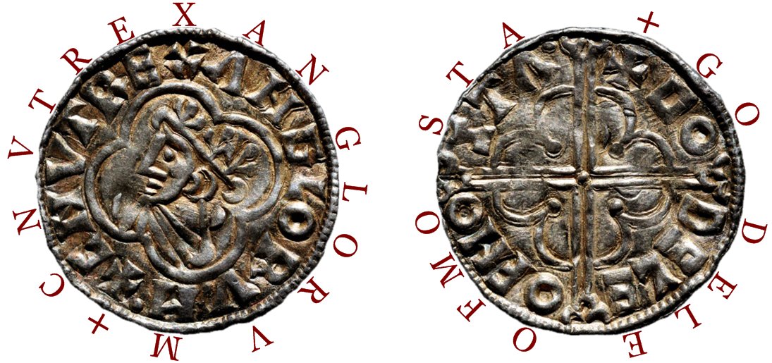 Åtsidans omskrift: + CNVT REX ANGLORVM (Knut, Englands kung)