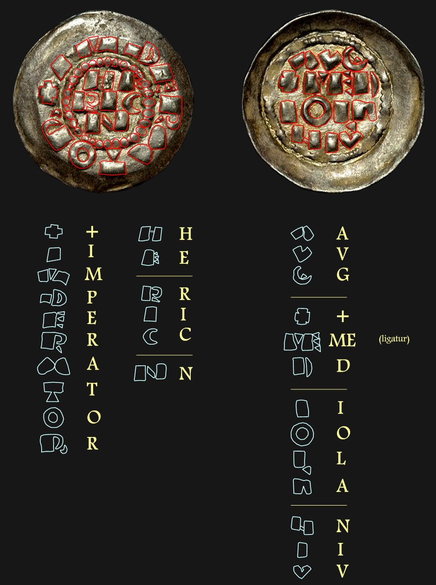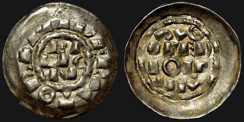 Denar, Henrik II, 1014 - 1024, Milano Ref. CNI V: 46,5 (Corpus Nummorum Italicorum) Myntet är svagt skålformat, vilket inte var ovanligt för