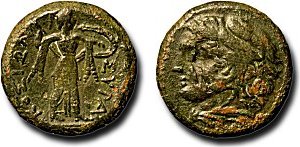 Klicka för större bild Litra, 278-276 f.v.t., Pyrrhus från Epirus, Syrakusa, 2 ggr förstoring. Diameter 22 mm. Vikt 10,795 gram. På åtsidan Athena Promachos och på frånsidan Herakles. |