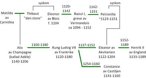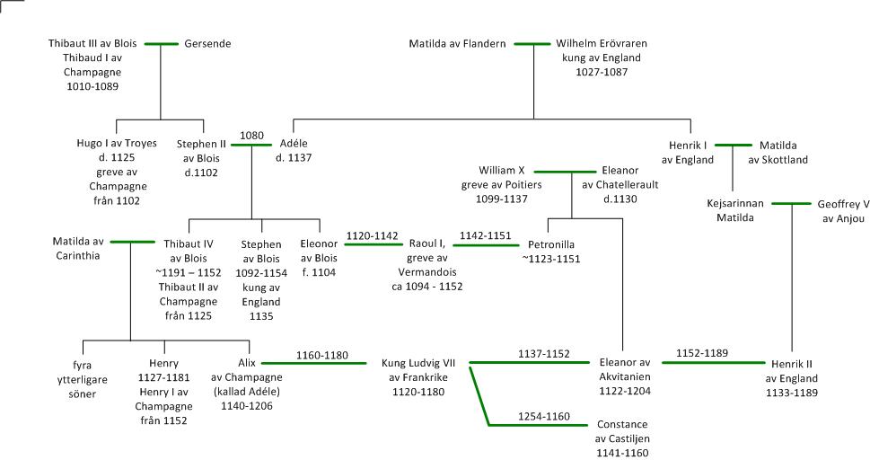 Se släktdiagrammet nedan som beskriver relationerna för personerna kring greve Thibaut och kung Ludvig VII. De vågräta gröna linjerna är äktenskapsband och årtal är inlagt som visar när äktenskapet ingicks eller hur länge det pågick. Kungen var gift tre gånger, så för honom blev det tre linjer. Drotsen Raul var gift två gånger så för honom blev det två gröna linjer.