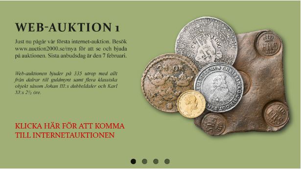 januari 2016 Internetauktioner på Misab Föreningens auktionsbolag Myntauktioner i Sverige (MISAB) börjar nu med internetauktioner. Tanken med internetauktionerna är att avlasta de ordinarie auktionerna volymmässigt. Lite enklare material kommer att säljas via den nya internetkanalen och det bättre materialet som tidigare på de ordinarie auktionerna i mars och september. Vid den första auktionen som har slutdatum söndag den 7 februari kommer inte mindre än 335 lots att säljas. Huvudsakligen består utbudet av svenska objekt, allt från medeltid fram till kronmyntsperioden. Det är en bra blandning av svenska objekt som säljs. Allt från lite större objekt i riksdalervalör ofta med någon form av åverkan till småmynt i hög kvalitet. Till topparna får räknas Johan III:s 2 daler utan år och 2 1/2 öret 1661. Den första med inskription och den senare i lite lägre kvalitet, 1. Utropspriserna är i intervallet från 300 till 5000 kronor. Första auktionsstart är 16.00 och sedan löper auktionen på med ett avslut per minut. Auktionen är öppen för alla, såväl medlemmr som icke-medlemmar. Ingemar Svenson