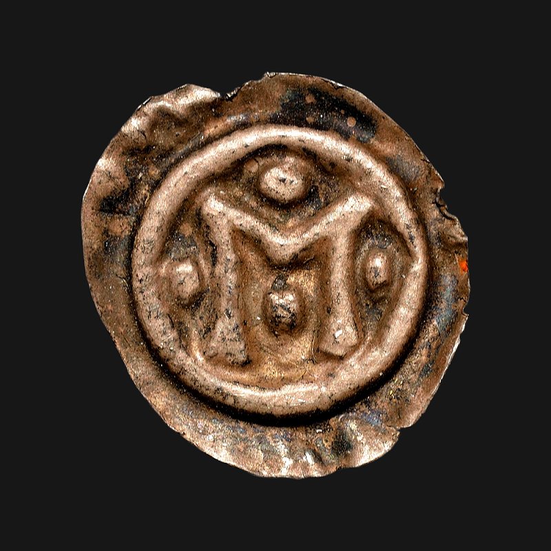 M inom slät ring med bokstaven omgiven av fyra kulor. LL X 3d.