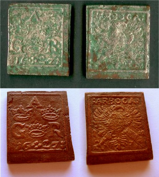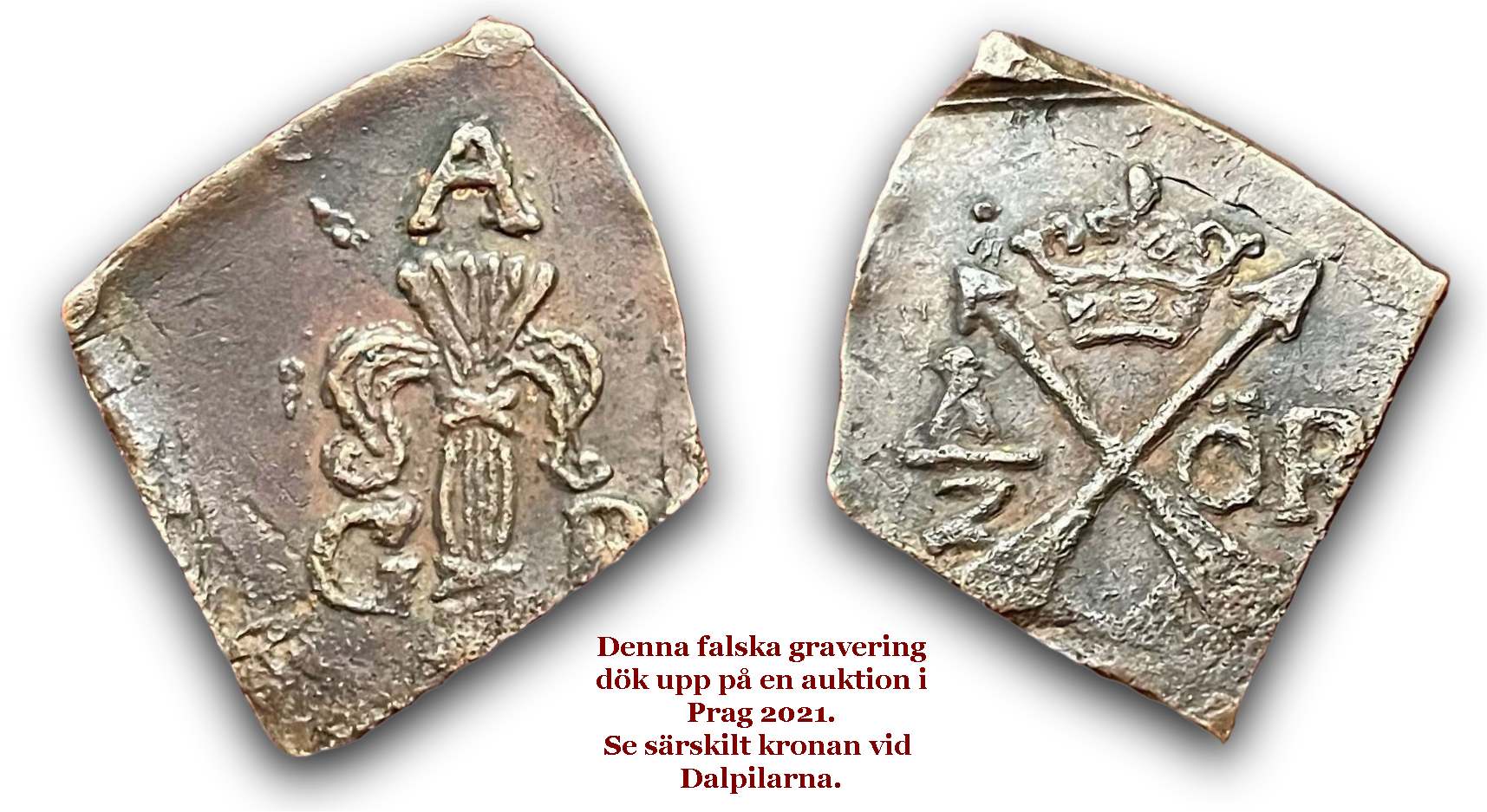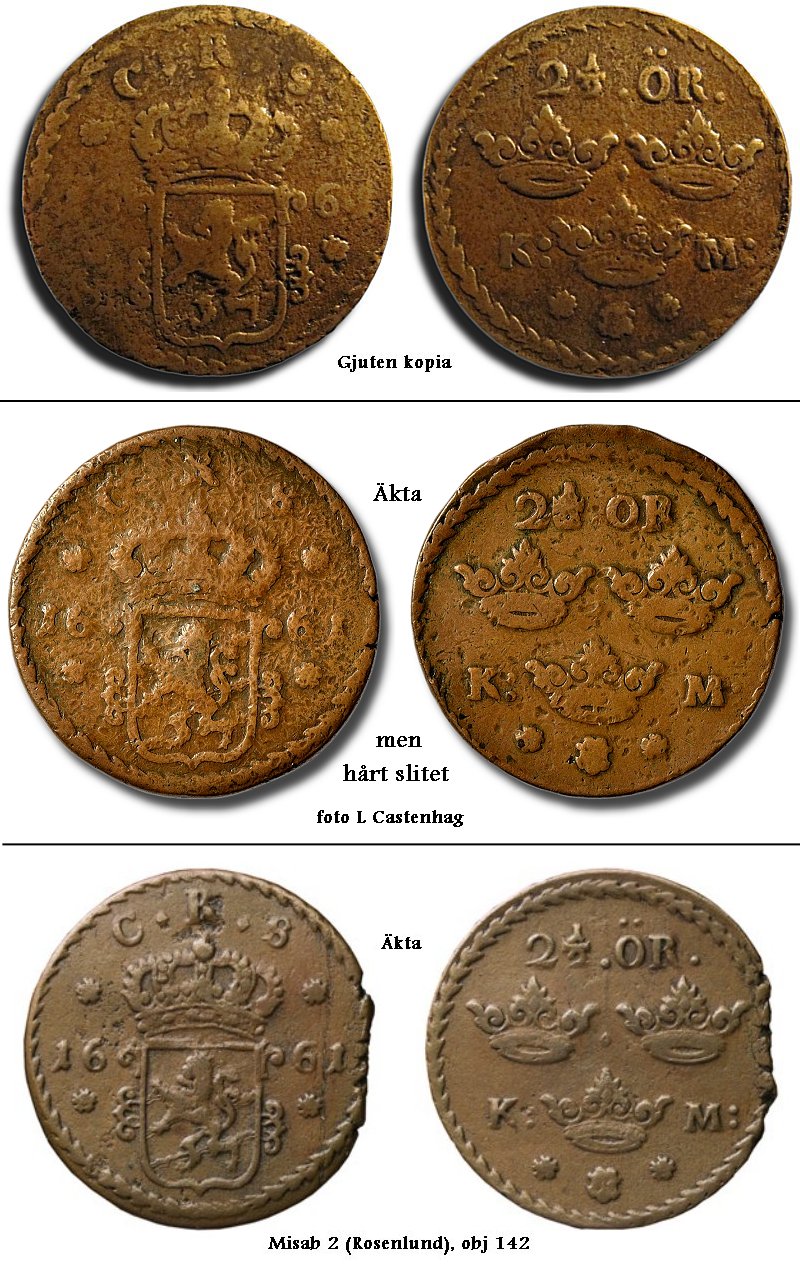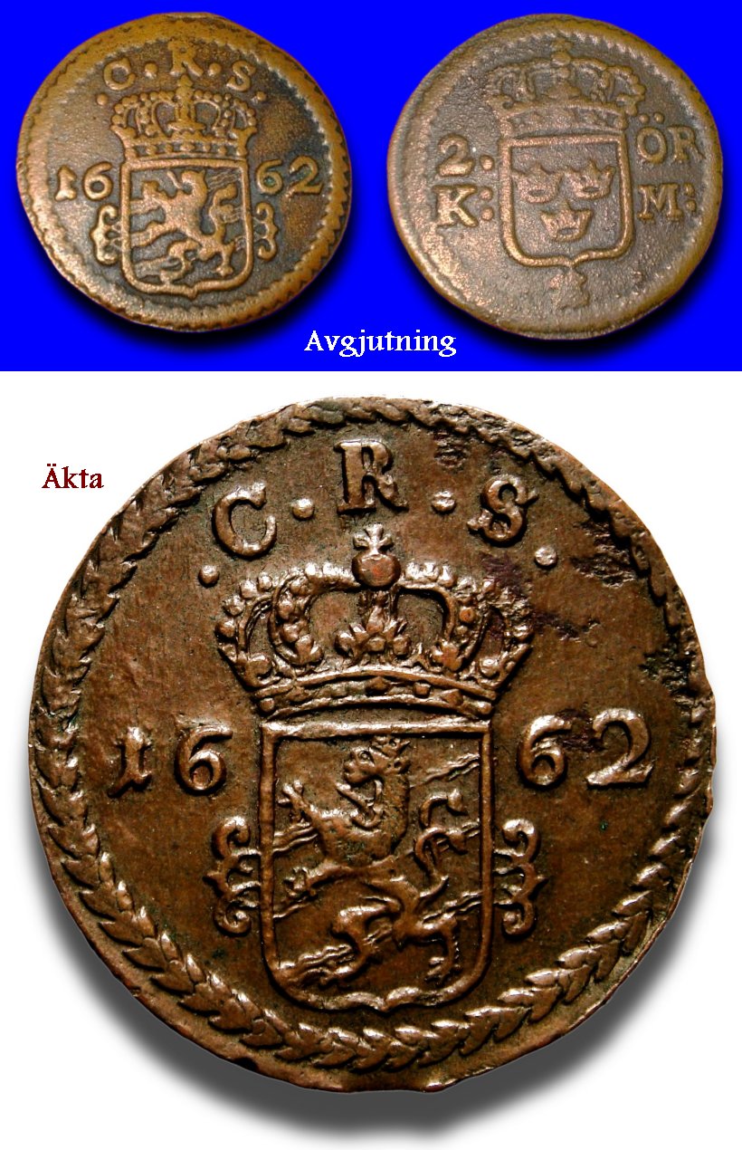 På en nätauktion 2010 utbjöds det eftertraktade typmyntet 2½ öre KM 1661. Säljaren insåg inte att det var en gjuten kopia han saluförde. Han informerades om misstaget och annonsen drogs tillbaka. Jämför avgjutningen med det hårt slitna äkta exemplaret. Det är "mera liv" i detaljerna på det äkta myntet trots att det är så slitet.