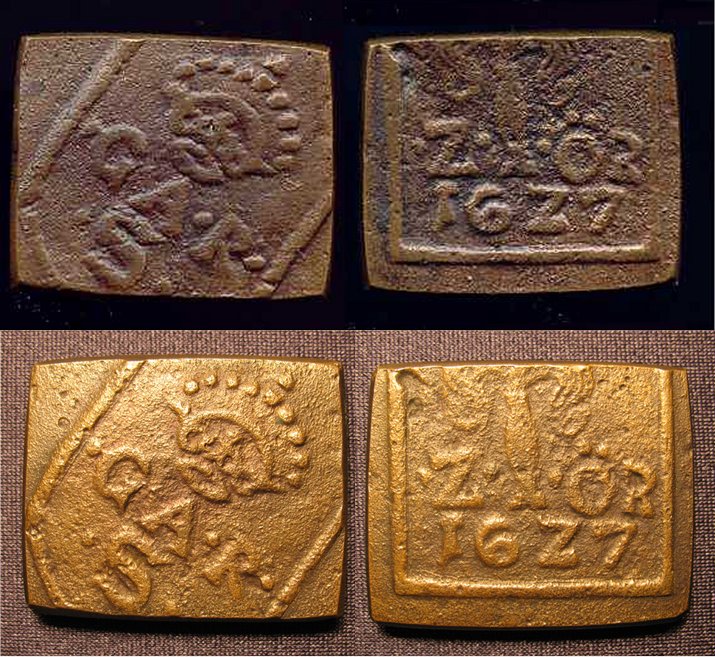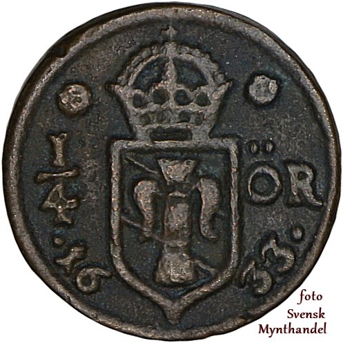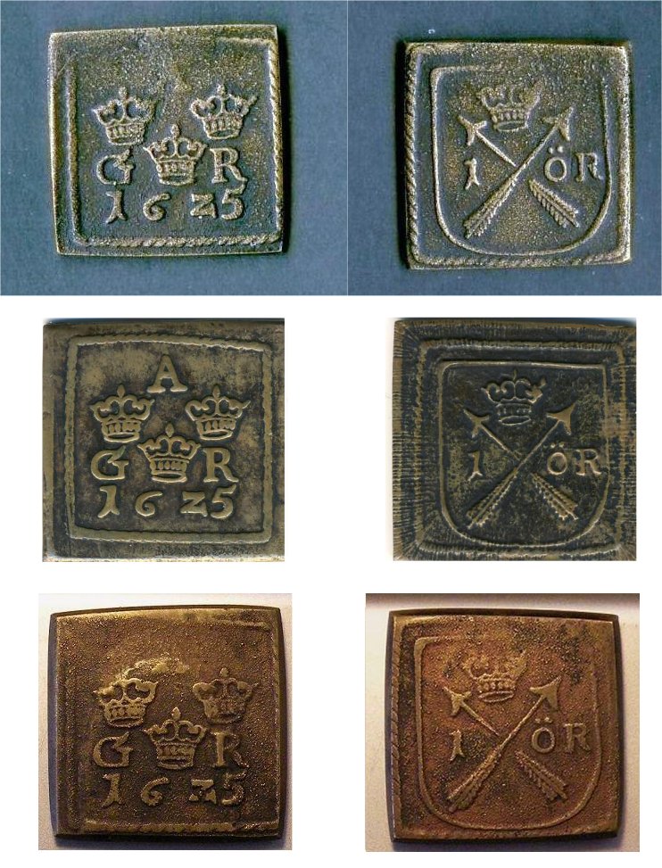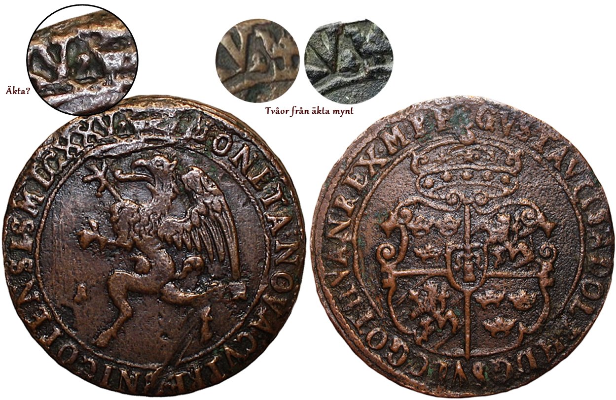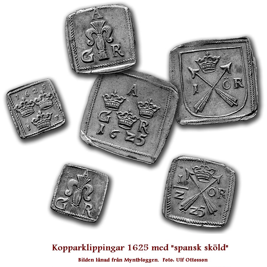 Kopparklippingen 1625 med "spansk sköld" dyker inte sällan upp på nätauktioner. Eftersom detta provmynt är ytterst rart torde det väl knappast vara något tvivel om att det är gjutna kopior som erbjuds.