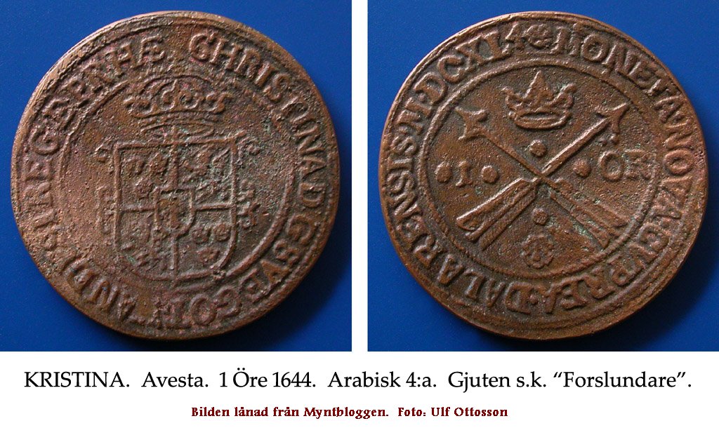 På 1960-talet började det dyka upp falska Kristinaören Avesta 1644 med arabisk 4:a. Upphovsmannen var handlanden Forslund i Lund som genom avgjutning lät tillverka dem i Köpenhamn. Man känner igen sådana mynt genom att granska bild- och textelement. Sten Törngren tar upp denna förfalskning i sin bok om varianter av Kristinas ettöringar av koppar.
