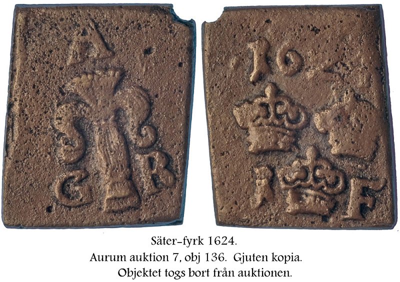 En gjuten fyrk 1624 råkade komma med på en Aurum-auktion, men objektet togs bort innan någon skada uppstod. Se den karaktäristiska