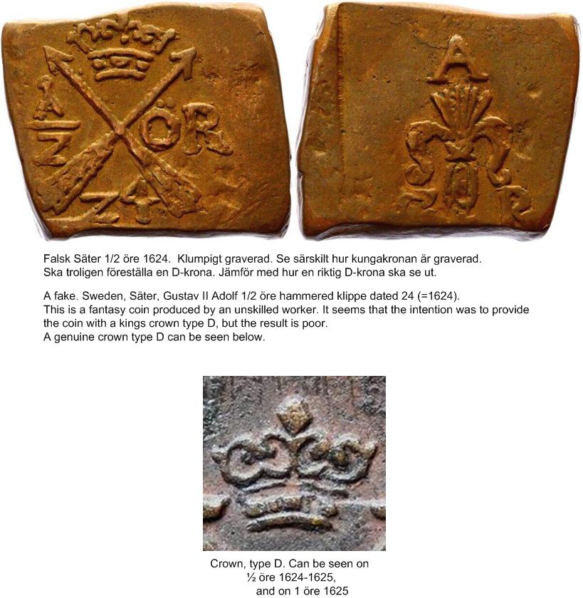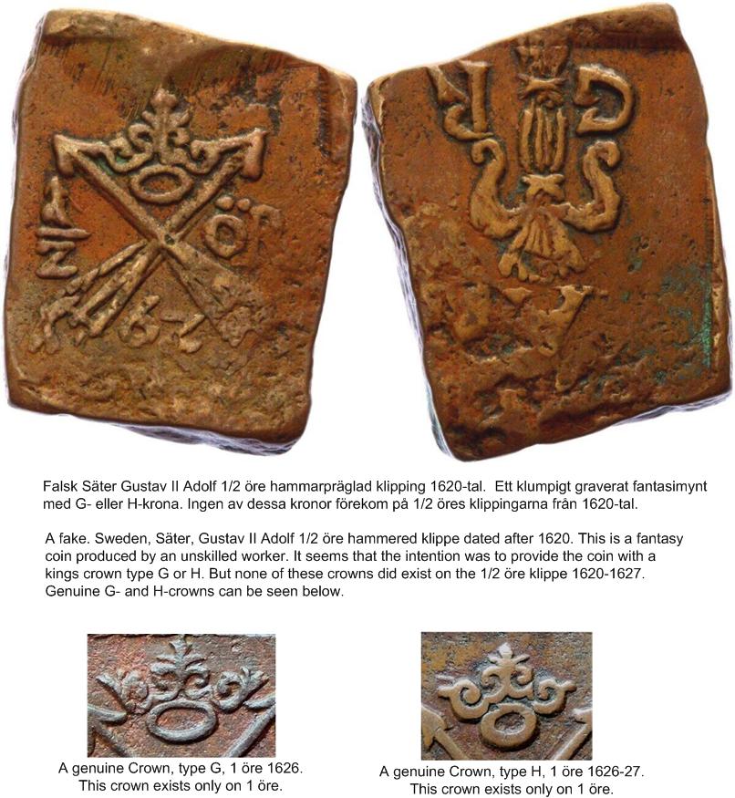 I Numismatiska Meddelanden VIII från år 1883 publicerade Olof Hallborg och Rudolf Hartmann sitt Utkast till beskrivning öfver Gustav II Adolfs och Christinas kopparmynt. Denna publikation är det stora standardverket för beskrivning av Gustav II Adolfs kopparmynt, men Hallborg och Hartmann råkade få med två falsarier. Dessa är: