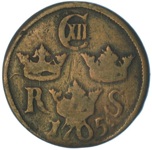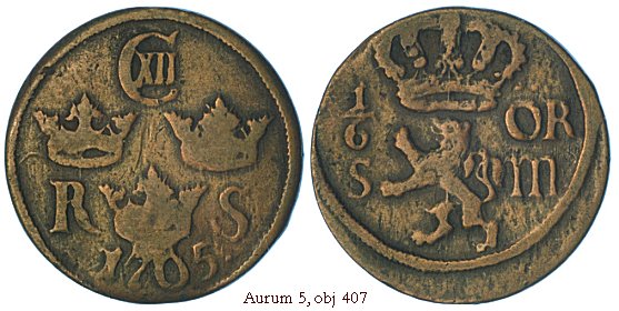 Ett mycket sällsynt mynt är 1/6 öre SM 1705, Karl XII. Detta mynt borde egentligen inte finnas eftersom typen färdigställdes först 1707.