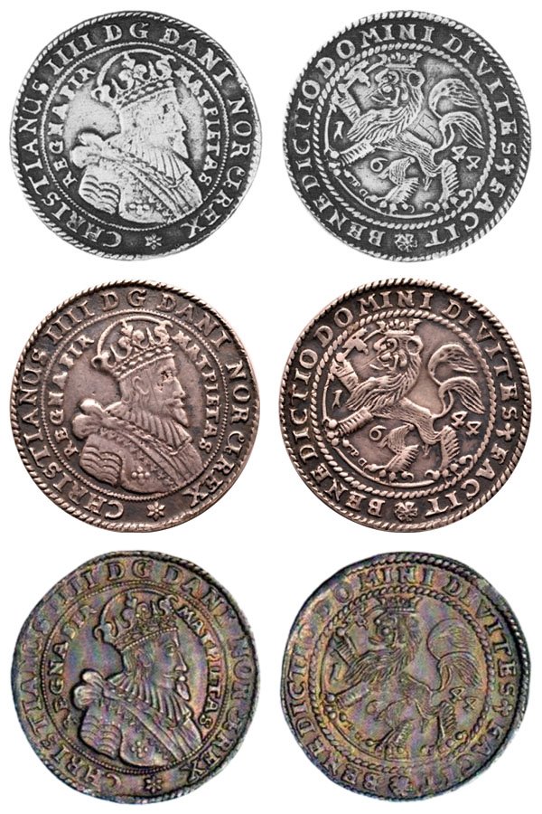Efter en del påfrestande turer fram och tillbaka löste det sig i alla fall till slut. Nedan visas bilder på de mynt som det här berättas om. Överst myntet från Brun-Rasmussen-auktionen (är det verkligen äkta?), därunder visas myntet från Frimärkshusets auktion och underst visas ett äkta mynt. Huruvida myntet från Bruun-Rasmussen-auktionen är identiskt med myntet från Frimärkshusets auktion är osäkert, men nog förefaller det vara en gjuten kopia.