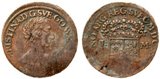 Som jämförelse visas nedan ett silvermynt ur Uppsala Universitets Myntkabinetts samlingar. Observera att både storlek och vikt överensstämmer tämligen väl med ovan presenterade kopparmynt.