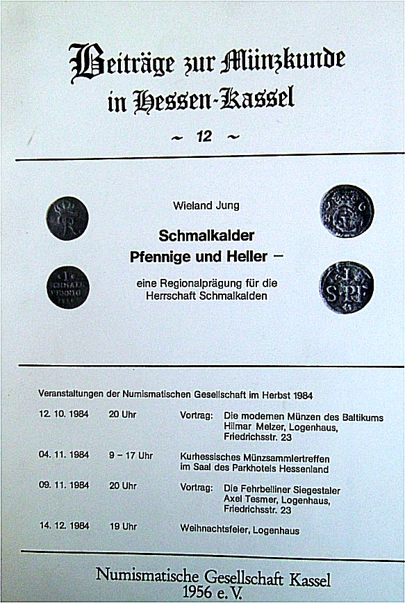 "Schmalkalder Pfenniger und Heller − eine Regionalprägung für die Herrschaft Schmalkalden" är en trevlig liten skrift om myntningen i Schmalkalden 1684-1754 skriven på tyska. Författare är Wieland Jung och skriften som är i A4 format gavs ut av Numismatische Gesellschaft i Kassel 1956.