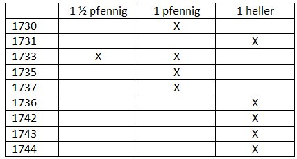 Flera varianter finns av de flesta mynten. För de 10 årtalen/valörerna som finns (se tabell ovan) redovisar Wieland Jung inte mindre än 35 olika mynt (typer, år och varianter). Den mest intressanta varianten (typen) måste vara en heller från 1736 där gravören i stampen "av misstag" graverat in det kungliga monogrammet på åtsidan "rätt-vänt". Detta misstag har resulterat i att de präglade mynten har fått ett spegelvänt kungligt monogram på åtsidan!