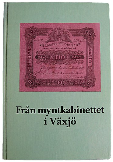 | Denna trevliga och mycket läsvärda numismatiska antologi är utgiven av Kronobergs läns Hembygdsförbund i samarbete med Smålands museum. Redaktörer var Gunnar Sundberg, läroverksadjunkt samt mångårig föreståndaren för museets myntkabinett och Lars Thor som vid tiden var landsantikvarie och chef för Smålands museum. Myntkabinettet brukar vanligen kallas "Wexiö gymnasii myntkabinett" men det är egentligen namnet på den stiftelse som förvaltar gymnasiesamlingen med ursprung från slutet av 1700-talet. Bokens första uppsats bär Sundbergs signatur och har rubriken "Två sekler i Växjö myntkabinetts historia". Den spännande berättelsen behandlar naturligtvis grundläggningen och de nödvändiga donationerna men också omfattande stölder. Den första och kanske största begicks före år 1804. Sundberg skriver att det var "en prästson i Växjö och en bondeyngling från Sandsjö" som utförde dådet. |