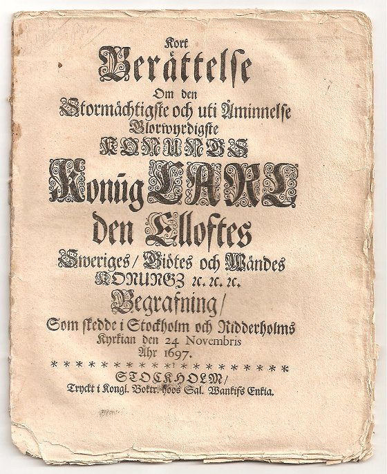 Detta sällsynta trycks fullständiga titel lyder: Kort Berättelse Om den Stormächtigste och uti åminnelse Glorwyrdigste Konungs Konung Carl Den Elloftes Sweriges, Giötes och Wändes Konungz &c. &c. &c. Begrafning, Som skedde i Stockholm och Ridderholms Kyrkian den 24 Novembris Åhr 1697.