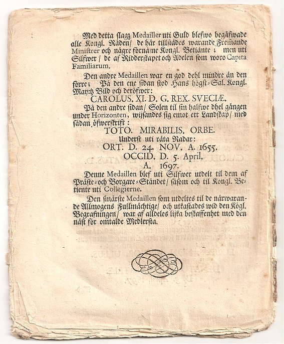 Det finns flera olika förordningar och kungörelser som beskriver mynt. Somliga, ganska sällsynta, har till och med bilder på mynt. Detta gäller särskilt de så kallade nödmynten, men även andra kopparslantar och några silvermynt finns avbildade i olika kungörelser. Syftet var ofta att visa på nya mynts utseende och giltighet. Dock finns mig veterligen bara en enda kungörelse som i detalj beskriver medaljer. Det är berättelsen och åminnelsen kring Karl XI:s begravning. Det är ett litet tryck i kvartoformat på 28 sidor. Tryckt i Stockholm hos Wankijffs änka. Trycket är från dödsåret 1697. På de inledande sidorna får vi följa sorgetåget på dess färd genom Stockholm med alla musketörer, fanbärare, pukslagare, adel och annat finfolk. Vi får ta del av sorgemusiken och den följande ceremonin. Avslutningsvis i denna lilla skrift beskrivs "trenne medailler af åthskillig storlek uti guld och sölfwer förfärdigade" för just detta tillfälle. Jag tänker inte upprepa beskrivningarna här då medaljerna beskrivs av Hildebrand som nr 131, 133 och 134. Det kanske mest intressanta är att denna kungörelse berättar för oss hur medaljerna delades ut och till vilka. Således en viktig historisk och numismatisk källa. Den största medaljen i guld gavs till de kungliga råden, närvarande ministrar från fjärran länder samt några "förnäme kongl. Betiänte". Samma medalj i silver gavs till ridderskapet och adelns "capita familiarum". Den mindre medaljen gavs präste- och borgareståndet samt till "kongl. Betiente" i kollegierna, samt utkastades vid begravningen som kastmynt.