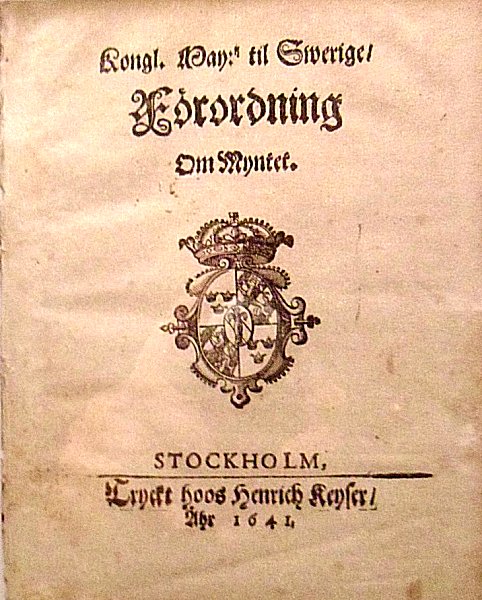 Detta lilla litteraturtips får illustreras med en relativt tidig förordning, Förordning om myntet från 1641. En förordning jag inte tänker gå djupare in på än att förordningen som titeln antyder handlar om myntväsendet under drottning Christinas nionde år på tronen, då blott 15 år gammal!