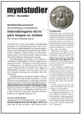 | Tidskriften Myntstudier är en föregångare digitalt. Redan 2003 började Numismatiska Forsknings- gruppen vid Stockholms Universitet under ledning av professor Kenneth Jonsson att ge ut Myntstudier. Senaste numret publicerades 2014 och vi intresserade väntar med spänning på nästa nummer av denna läsvärda tidskrift. Du behöver alltså inte söka efter Myntstudier på något antikvariat utan det räcker att klicka på länken nedan för att direkt komma åt de nästan 30 nummer av tidskriften som utgivits till dags dato. Fortsätter du sedan att botanisera på Numismatiska Forskningsgruppens hemsida kommer du att upptäcka att det finns en rad andra intressanta böcker och uppsatser att ladda ner eller läsa direkt på din dator. |