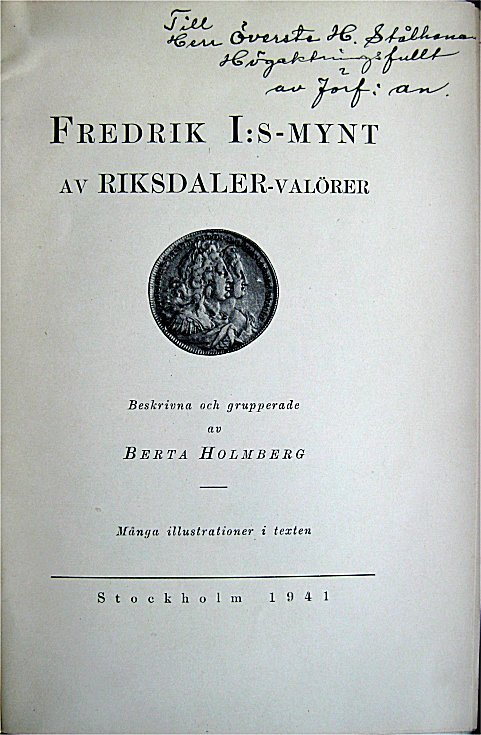 Att Berta Holmberg närde ambitioner om ett mer omfattande numismatiskt författarskap råder det som sagt inga tvivel om. Hon lät även publicera sig i utländska tidskrifter, bl.a. i The Numismatist. Detta litteraturtips skall emellertid handla omett litet trevligt häfte med titeln Fredrik I:s-mynt av riksdaler-valörer. Kungl. Boktryckeriet P. A. Nordstedt & Söner tryckte år 1941 de 22 sidorna "å lumptryckpapper i 300 ex." − alltså bara ett par år före hon avled. Berta Holmberg skriver i eftertexten att "Föreliggande lilla arbete är en studie över Fredrik I:s svenska silvermynt av riksdaler-valörer: 2, 1, ½ och ¼ rdr, och utgives i förhoppning, att det skall vara typ- och variantsamlare till tjänst. Det utgör en beskrivning och systematisering, och i stort sett har jag tillämpat det system, jag utarbetade vid behandlingen av Carl XI:s-mynten." Kuriöst och av något diffus anledning är Stora Kopparbergets Bergslag kopparpolletter av markvalör mellan åren 1721-23 medtagna!