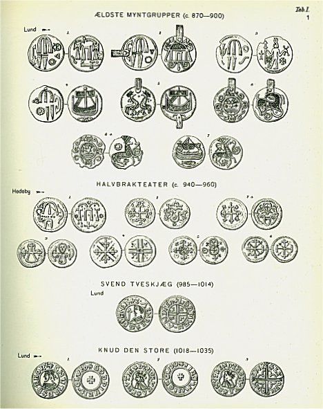 Nedan visas den första planschen (något förminskad) som behandlar mynten för Harald Blåtand, Sven Tveskägg och några inledande mynt för Knut den store. Mynten är individuellt numrerade per regent.