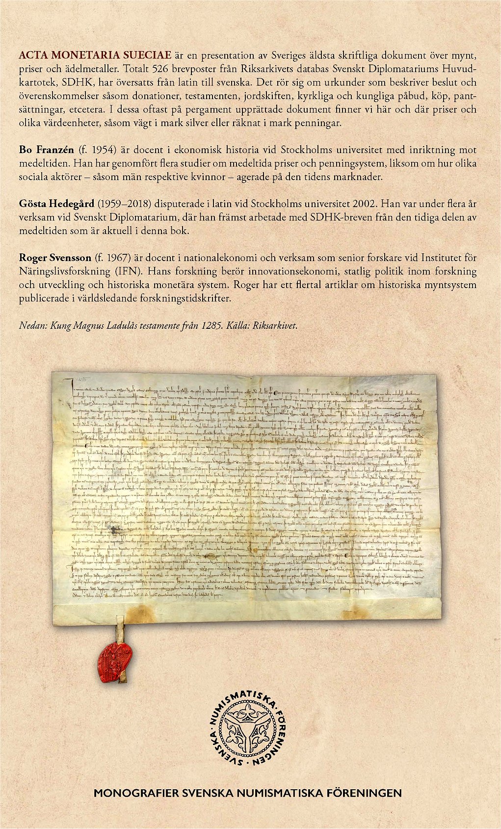 ACTA MONETARIA SUECIAE är en presentation av Sveriges äldsta skriftliga dokument över mynt, priser och ädelmetaller. Totalt 526 brevposter från Riksarkivets databas Svenskt Diplomatariums Huvudkartotek, SDHK, har översatts från latin till svenska.