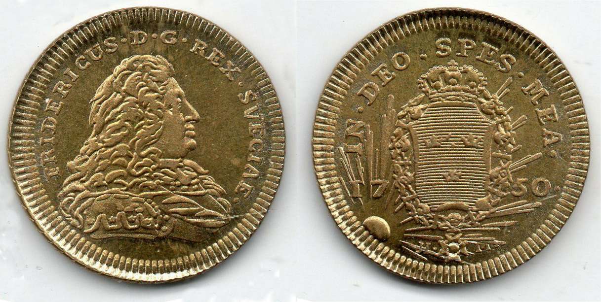 Diameter 22,2 mm. Vikt 3,49 g (av ostindiskt guld) Ref SM 42.