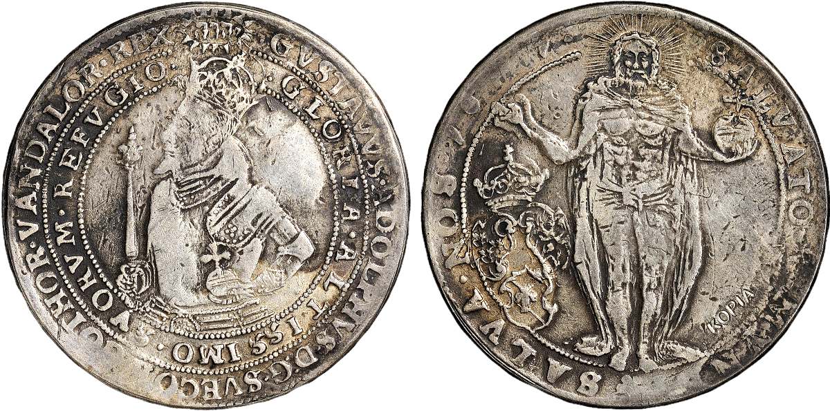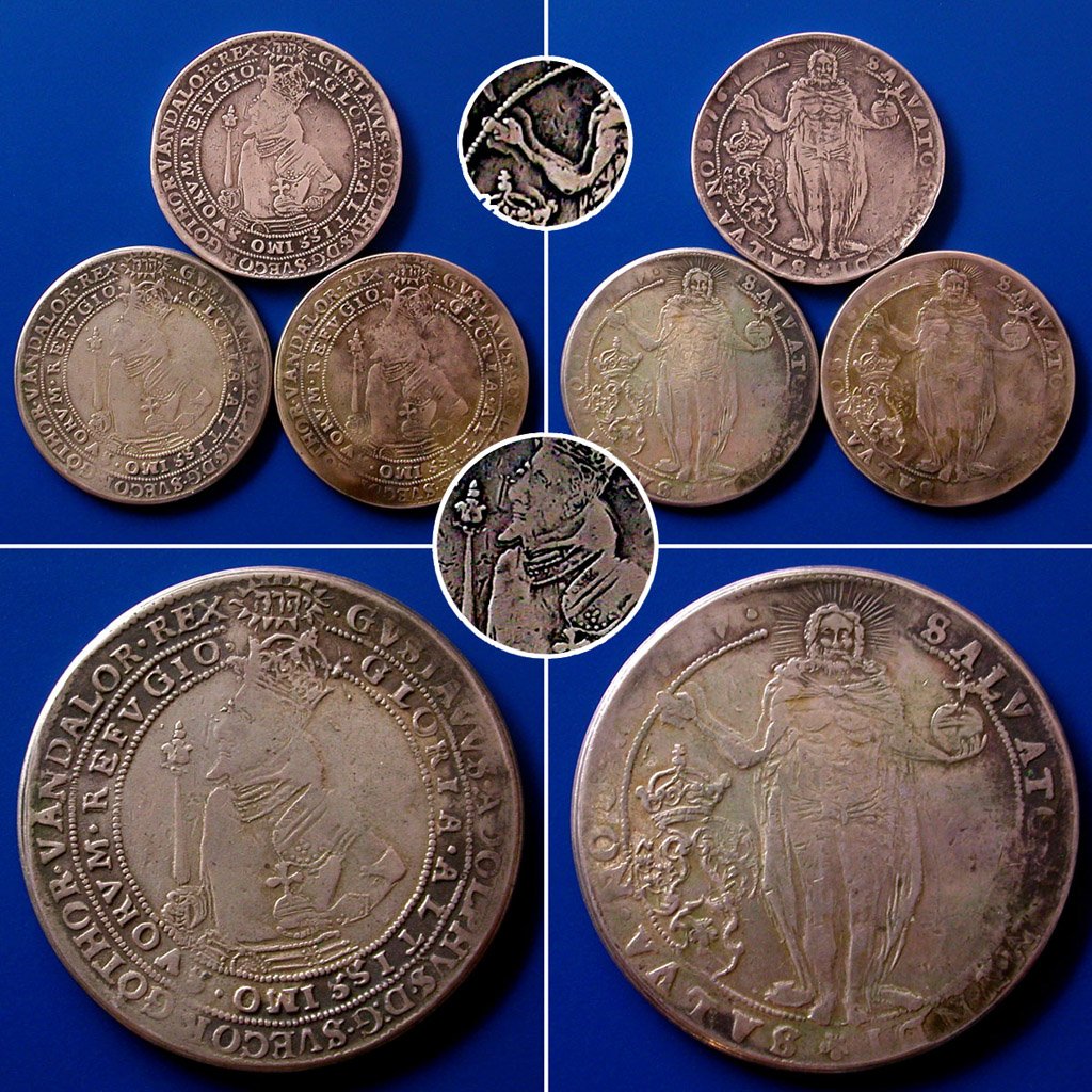 Observera hur frälsarens hand på Gustav II Adolfs riksdaler 1617 av misstag har blivit punsad tre gånger. Denna felaktighet finns med på alla de falska exemplaren. Samma sak gäller stampklumparna framför ögonen på kungens porträtt.