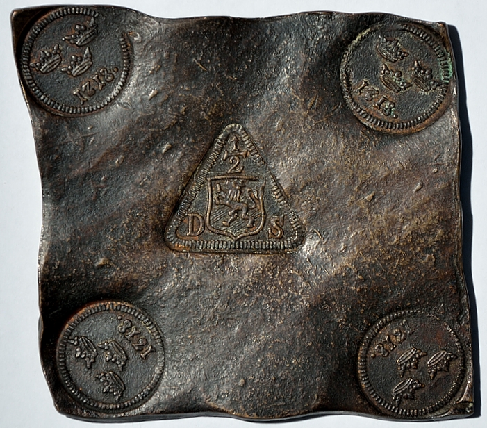 Här är en kopia av 1/2 DSM 1718. Plåten är lite lurig eftersom stämplarna inte ser typiskt gjutna ut. Möjligen har de slagits in i den heta gjutna plåten medan den var någorlunda mjuk.