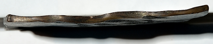 På baksidan är det ett mönster som ser överdrivet och onaturligt ut. Tittar vi på kanten ser vi att den är slät och fin. Det här är inget äkta plåtmynt. Kronorna i hörnstämplarna är dessutom alldeles för breda.