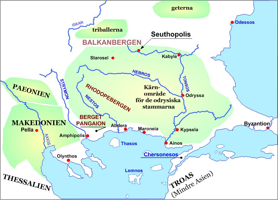 Trakien på 400-talet f.v.t. Den grekiska staden Ainos låg vid floden Hebros utlopp i Egeiska Havet.