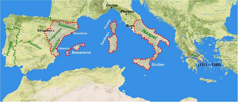 Aragonien under Alfons V på 1440-talet. Hertigdömet Aten hade ingått i imperiet under tidigt 1300-tal.