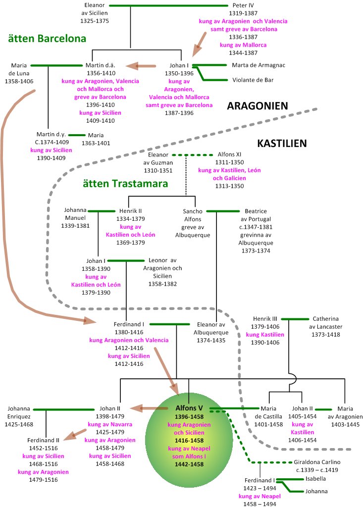 Alfons V (1396-1458) var son till Ferdinand I av Aragonien och Eleanor av Alburquergue. På fädernet var Alfons en del av den mäktiga grevesläkten Barcelona. På mödernet härstammade han från den framstående släkten Trastamara som hade tagit makten i Kastilien 1369. Kungarna av Aragonien hade ju sedan tidigt 1200-tal härskat över Sicilien, och Alfons ärvde detta kungadöme.
