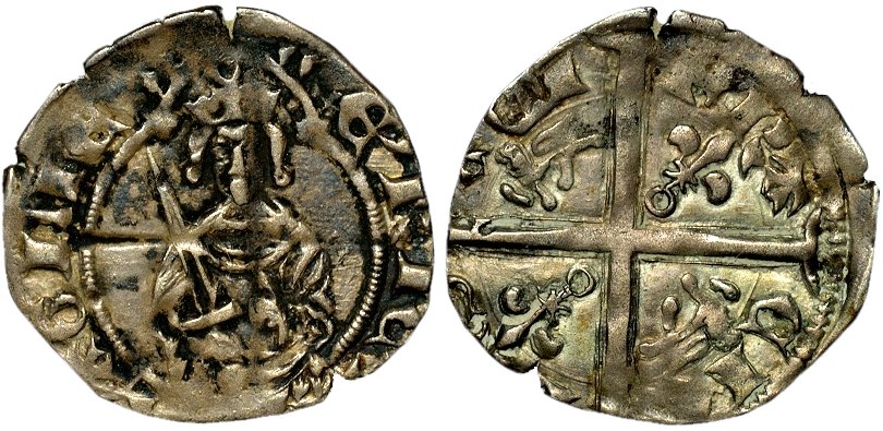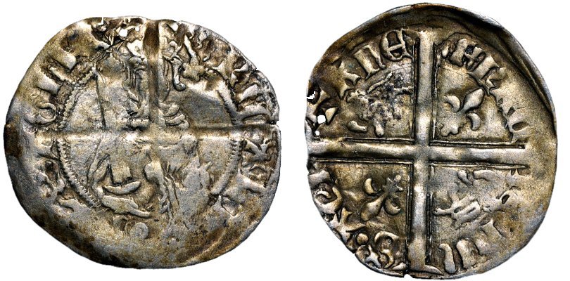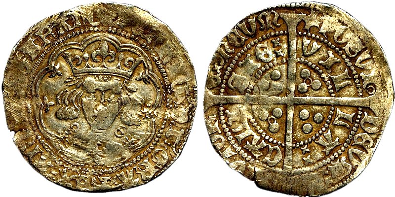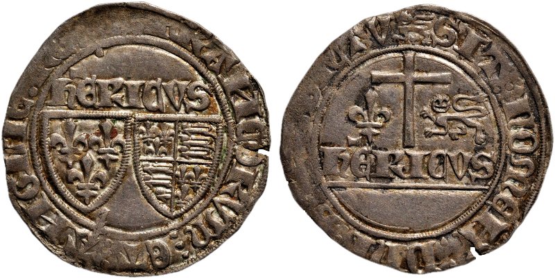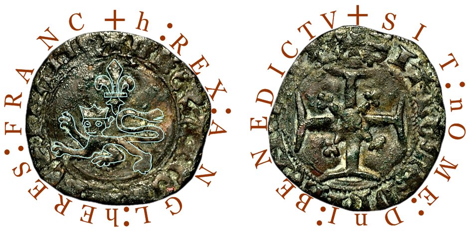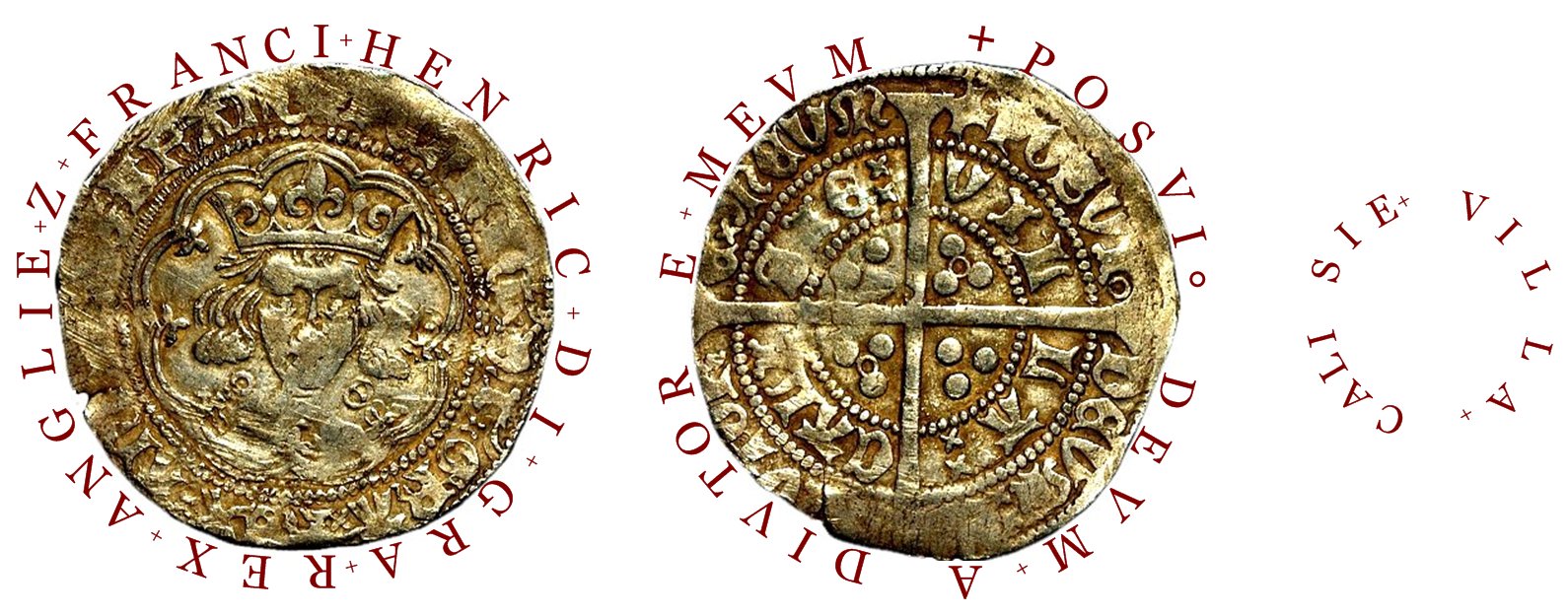 Nedanstående mynt är präglat i Calais någon gång under åren 1413 − 1422 för Henrik V, men det är inget anglo-galliskt mynt eftersom det är slaget efter engelsk myntfot. Myntet var således gångbart som betalmedel i Britannien.