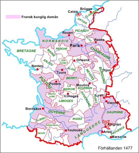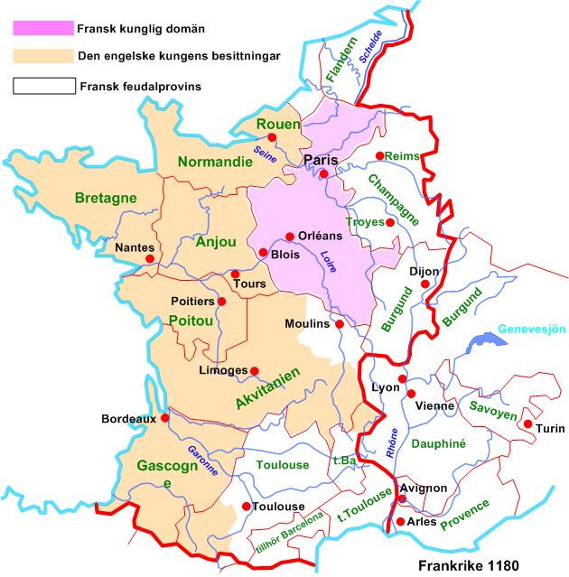 Den franska kronans domäner i Frankrike var tämligen blygsamma på 1100-talet. Nedanstående karta visar den franska kronans domäner och de engelska besittningarna i Frankrike.