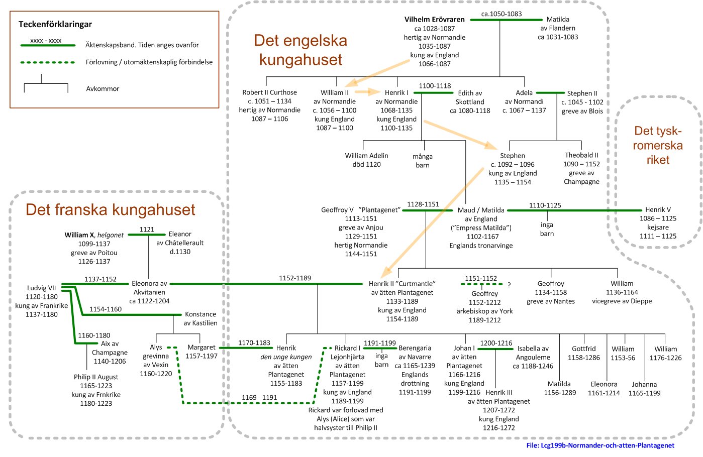 År 1152 gifte sig Henrik Curtmantle med hertiginnan Eleonora av Akvitanien. Han fick därmed kontroll över provinserna Poitou, Akvitanien och Gascogne. Två år senare blev han kung av England som Henrik II vilket innebar att hans stora jordarealer i Frankrike blev engelska besittningar. Normandie hade sedan tidigare blivit engelsk besittning genom att Vilhelm Erövraren blev engelsk kung år 1066. Han var morfars far till Henrik II. Se följande släktträd.