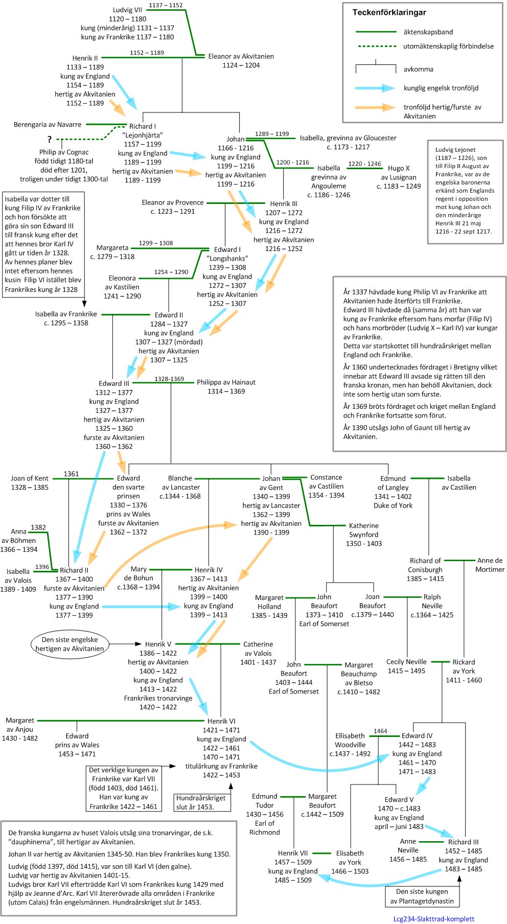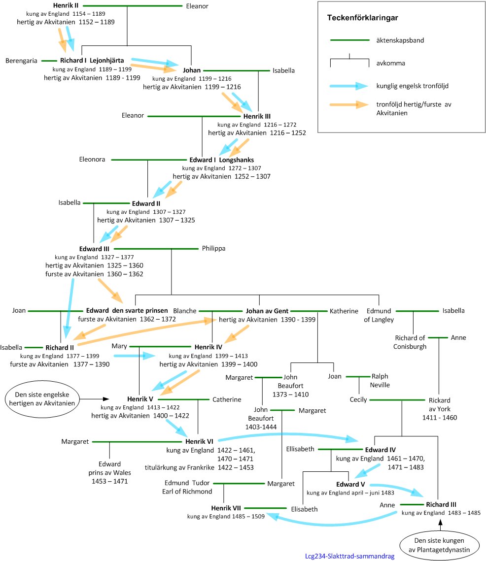 Det var vanligt att den engelske kungen också var hertig av Akvitanien från 1100-talet till början av 1400-talet, men det fanns undantag. De blå pilarna i nedanstående diagram visar hur den engelska kungakronan ärvdes och de gula pilarna visar hur hertigtiteln för Akvitanien ärvdes.