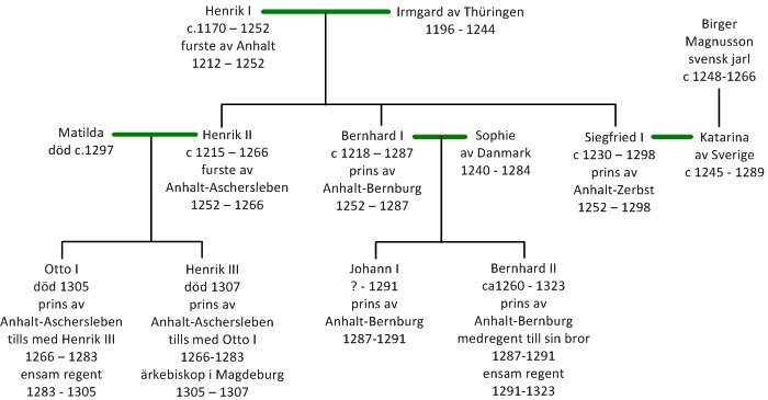 Av följande släktdiagram framgår hur furstendömet Anhalt delades upp i tre delar av ättlingarna till Henrik I strax efter år 1252.