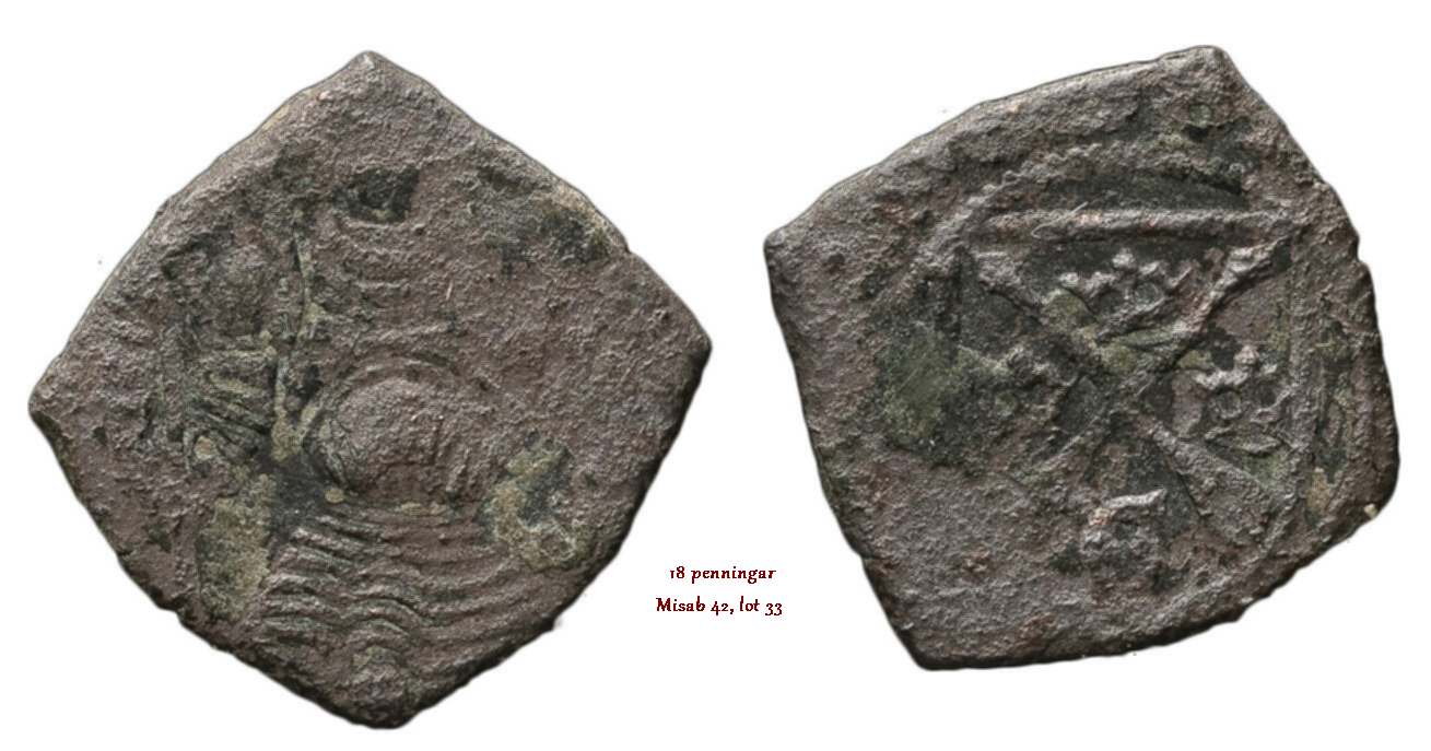 | 3. | Gustav Eriksson Vasa lät prägla 18 penningar. Detta var ett reguljärt svenskt mynt med ungefär samma storlek som hans imitationer av de danska mynten men de hade annorlunda prägling. |