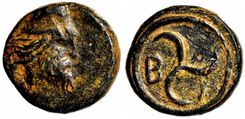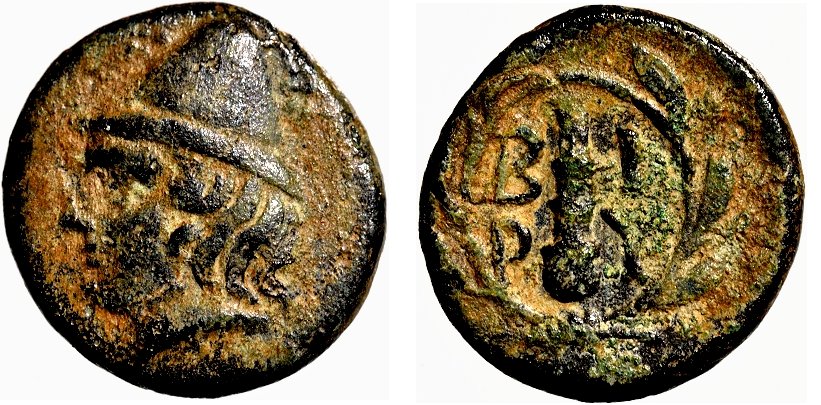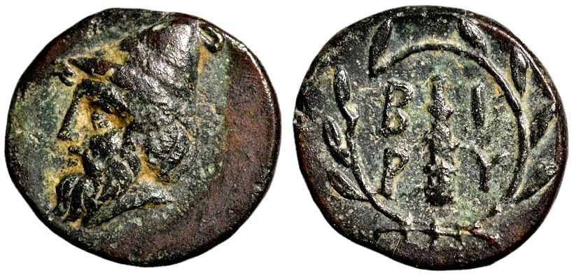 | Åts: | Kabeiros utan skägg, iförd toppig hatt. | Frs: | En knölpåk inom en lagerkrans. De grekiska tecknen B - I / P - Y på ömsidor om knölpåken, dvs BIRY[tis] |
