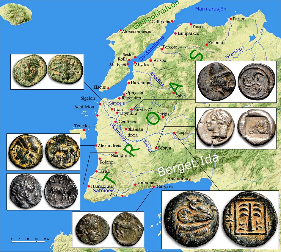 Nedan visas en karta över regionen Troas i nordvästra Mindre Asien. Ett antal antika städer inklusive ett förslag till positionen för staden Birytis har ritats ut. För några av städerna visas exempel på mynt. Alla dessa mynt är av brons utom mynten för Kebren och Neandreia, som är silvermynt. Flertalet mynt är pyttesmå, 8 - 12 mm, men myntet från Skepsis har en diameter av 16 mm.