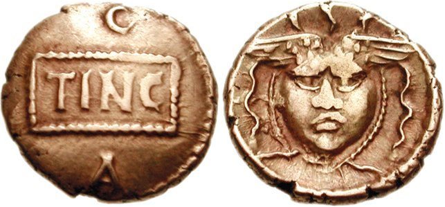 På åtsidan står det TINC inom en rektangulär ram, dvs Tincomarus.