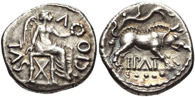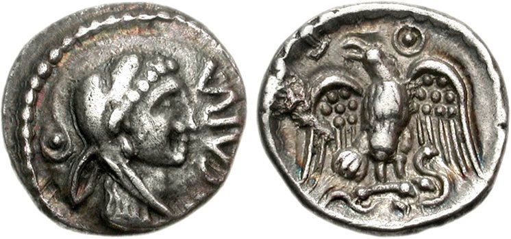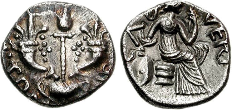 ABC och Van Arsdell är inte överens om till vilken myntherre detta mynt ska attribueras. Van Arsdell föreslår att det är kung Verdica som är myntherre.