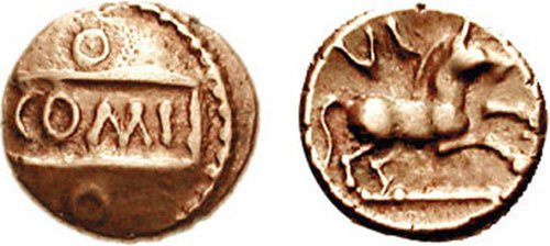 På åtsidan står det COMF inom en fyrkantig ram, dvs Commius rike.