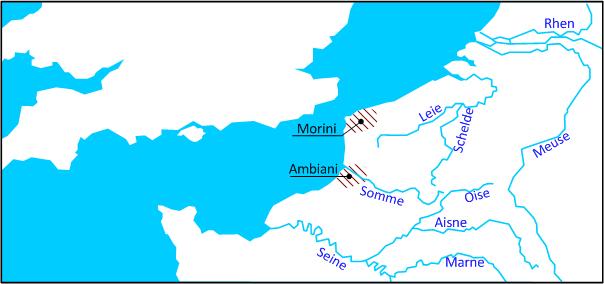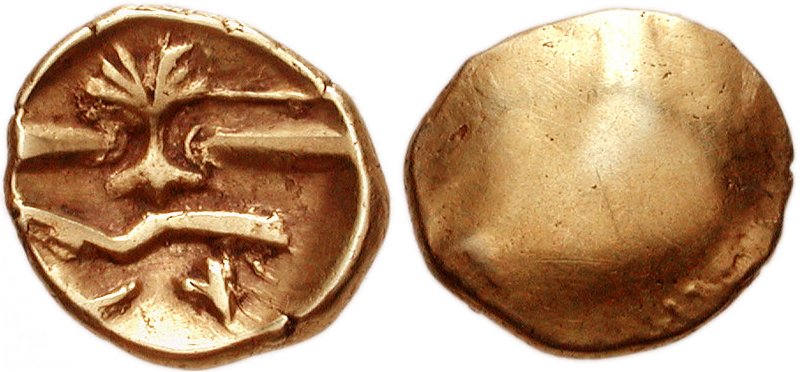 Ett annat guldmynt från kontinenten, upptäckt i England, visas nedan. Myntet är präglat av ett folk som kallade sig Morini. De bodde i ett område ungefär vid dagens Calais.