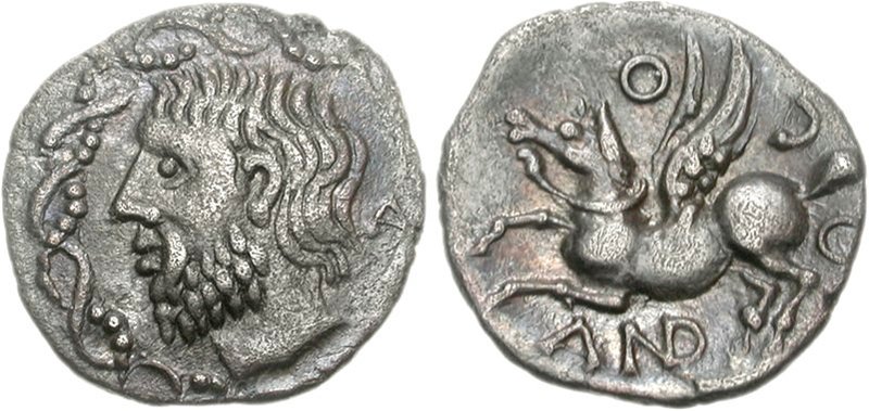 På frånsidan visas Pegasus vänd åt vänster med halsring (torques).